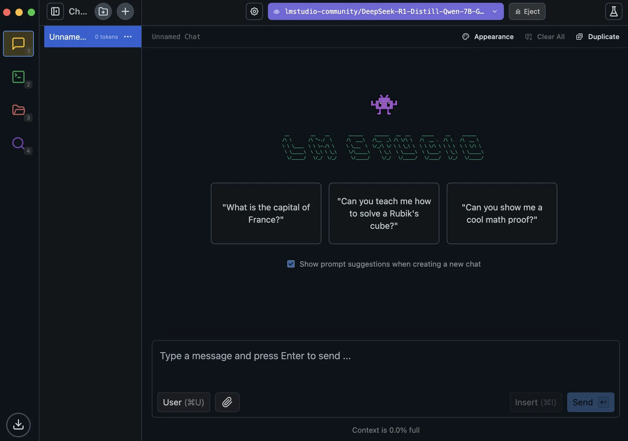 - Une fois le modèle DeepSeek R1 téléchargé, basculez vers l’onglet Chat et chargez le modèle.