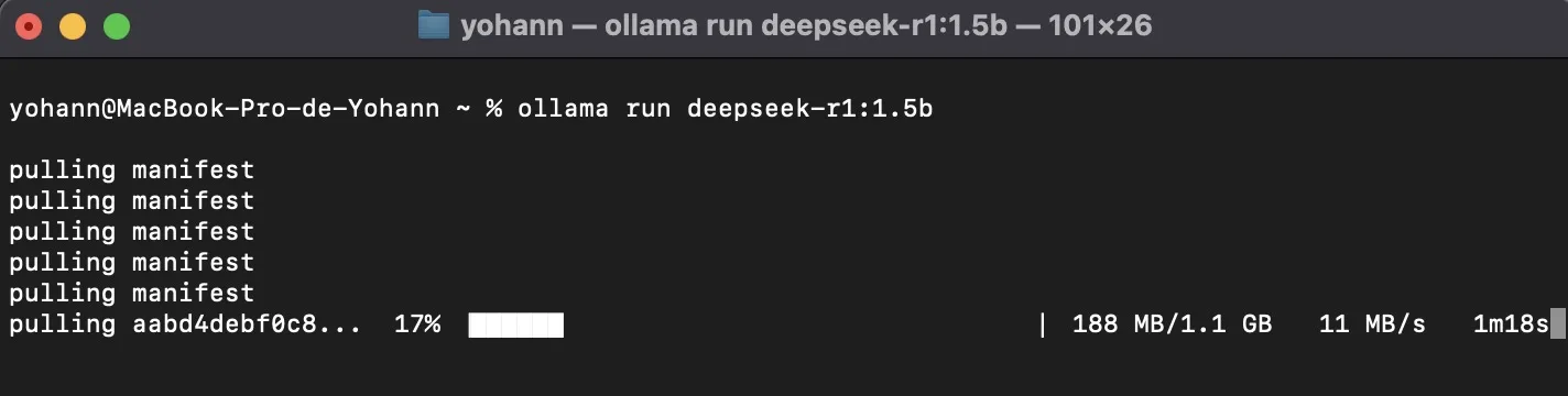 ollama run deepseek-r1:1.5b.pour lancer DeepSeek R1 en local. Il s’agit d’un petit modèle de 1,5 milliard de paramètres, dérivé de DeepSeek R1 et basé sur Qwen, conçu pour les ordinateurs modestes. Il n’occupe que 1,1 Go de mémoire.