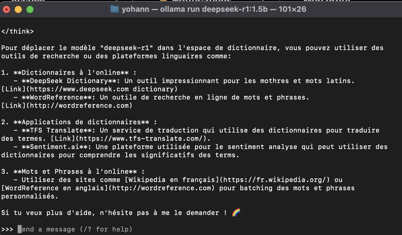 - Vous pouvez maintenant discuter avec DeepSeek R1 sur votre ordinateur en local. Profitez-en !