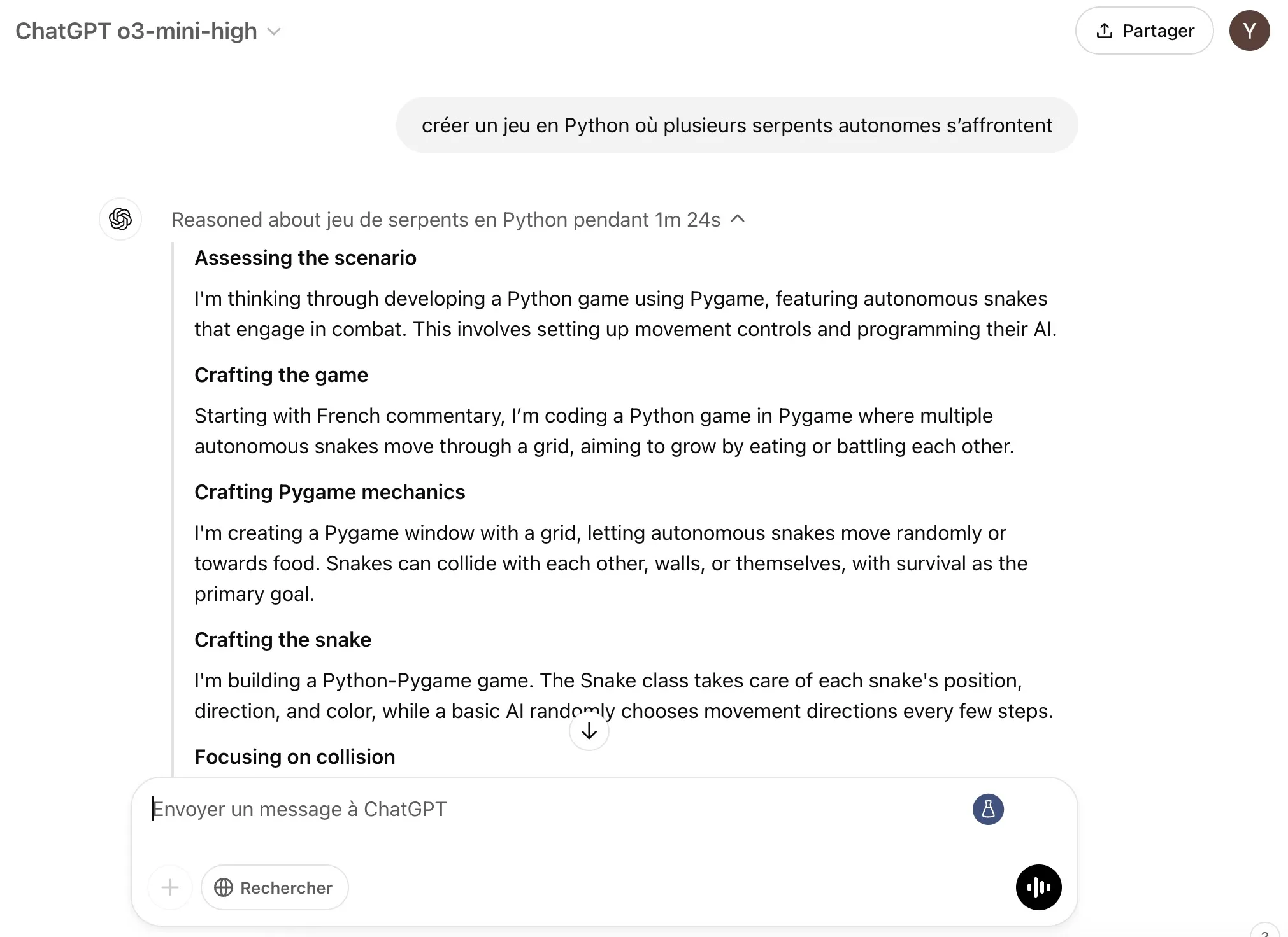 Lors de mes tests, j’ai demandé à o3-mini-high de créer un jeu en Python où plusieurs serpents autonomes s’affrontent. En 1 minute et 24 secondes, il a généré un code parfaitement fonctionnel, sans erreur.