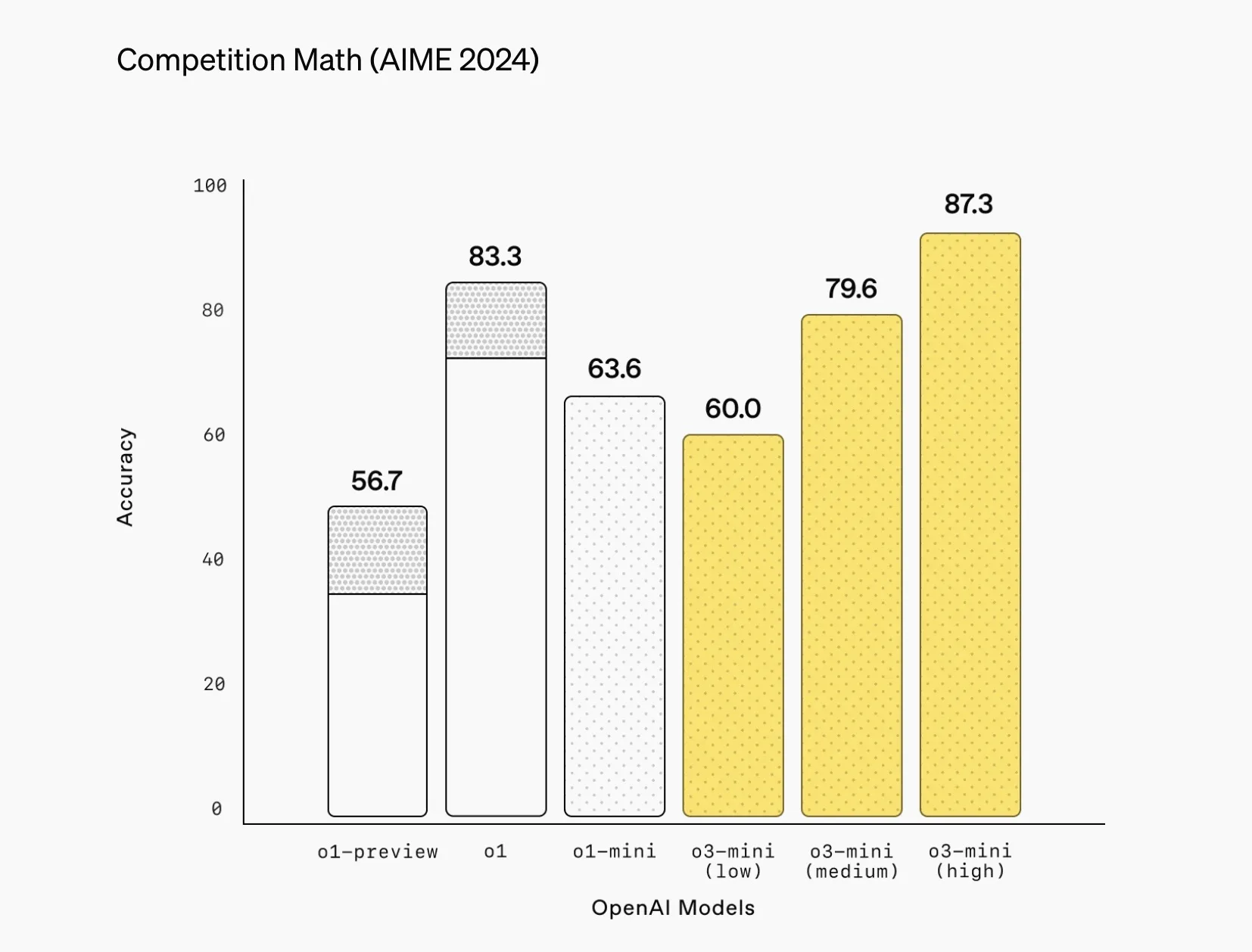 Outre la programmation, les mathématiques sont un autre domaine où o3-mini excelle. Lors de l’épreuve AIME 2024 (American Invitational Mathematics Examination), un test couvrant l’algèbre, la géométrie et la théorie des nombres, o3-mini-high a atteint un impressionnant 87,3 %, dépassant même o1.