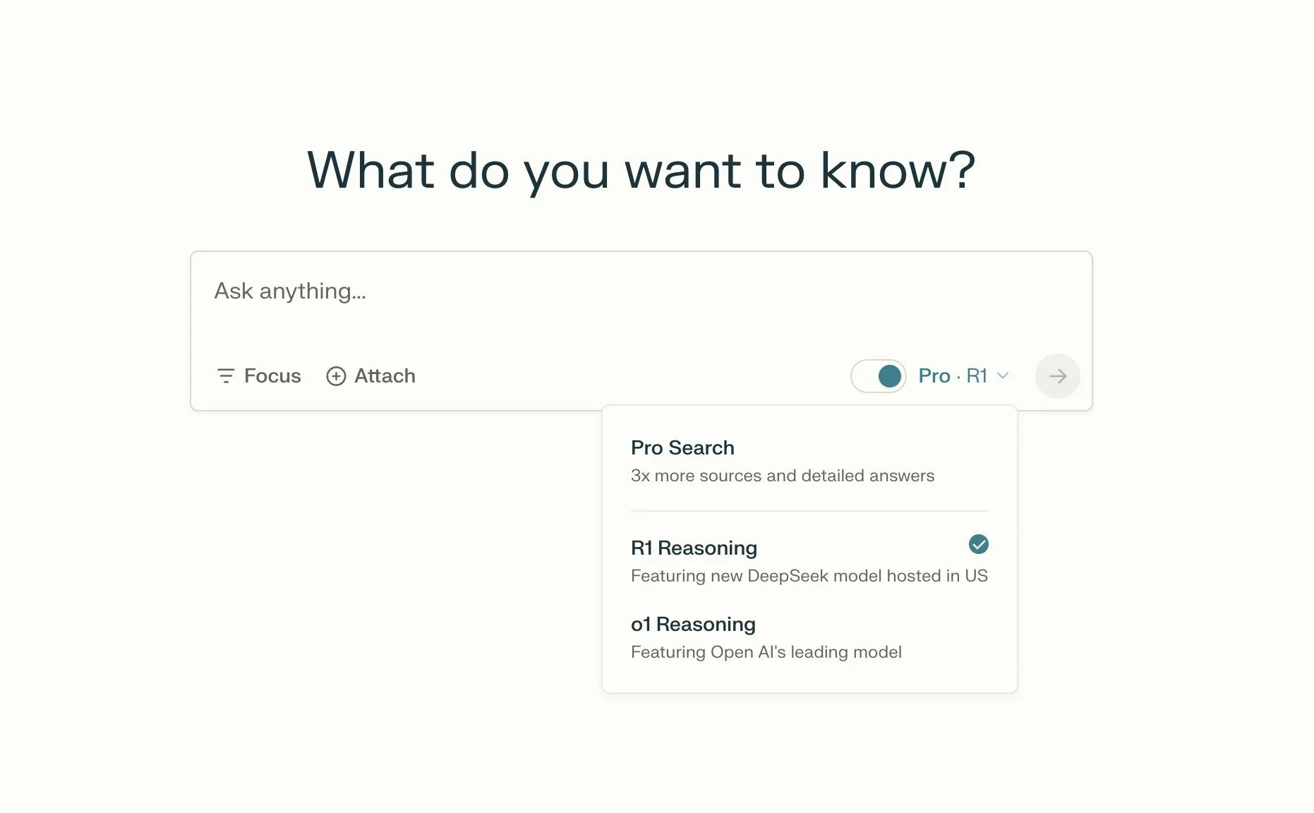 DeepSeek R1 is now available on Perplexity to support deep web research. There's a new Pro Search reasoning mode selector, along with OpenAI o1, with transparent chain of thought into model's reasoning. We're increasing the number of daily uses for both free and paid as add more… pic.twitter.com/KIJWpPPJVN