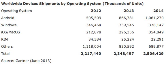 Android peut être nommé le grand vainqueur en 2013, mais ses concurrents auront également une bonne part de marché à se partager. Gartner prédit que Windows va réellement arriver à la deuxième place des ventes avec plus de 378 millions de dispositifs vendus, et ce en raison de l’augmentation des ventes de PC sous Windows 8. Apple arrive à la troisième place avec plus de 350 millions d’appareils iOS qui devraient être expédiés cette année. RIM est l’intrus de Gartner, puisque le cabinet prédit que 22 millions d’appareils seront expédiés cette année.