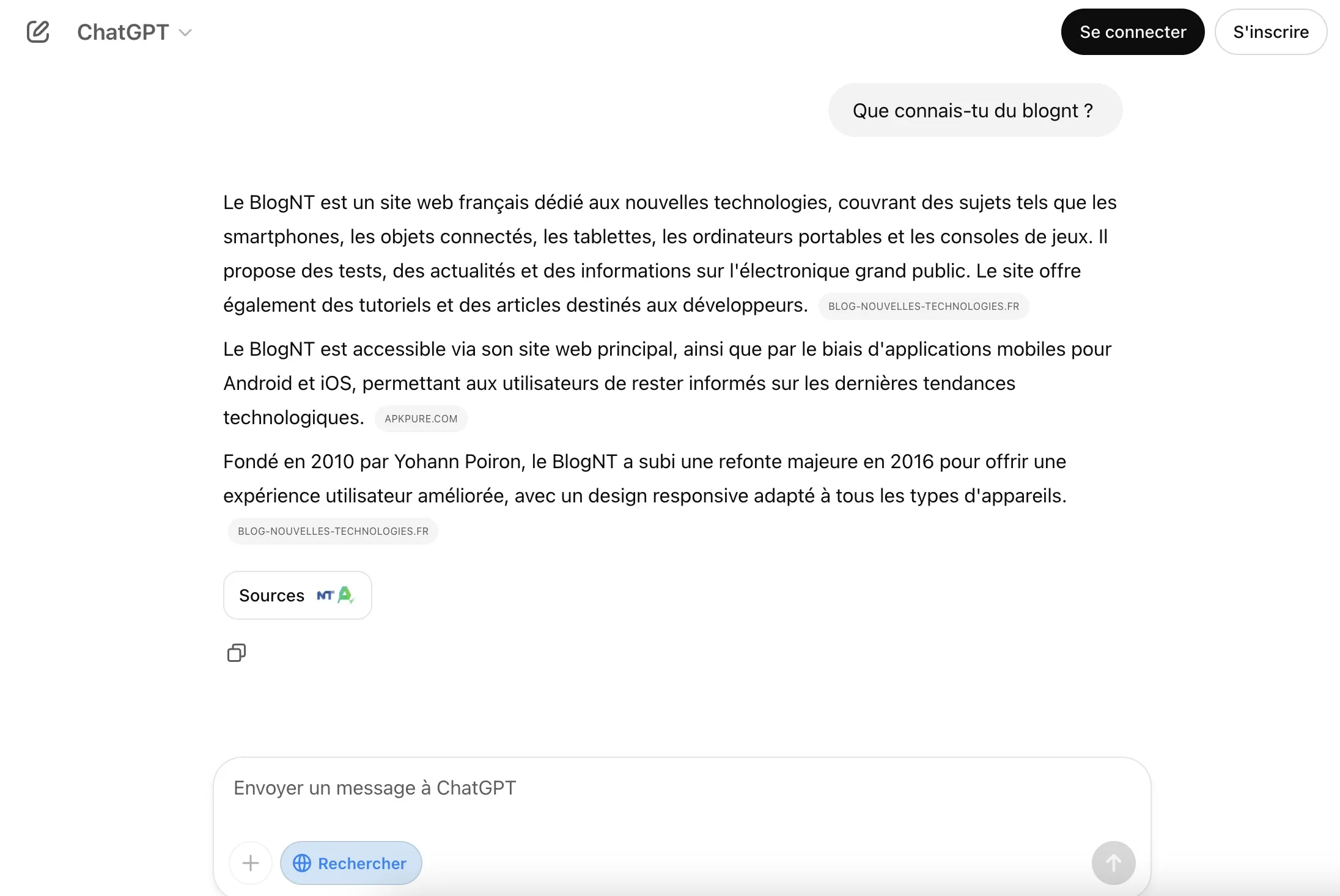 - Une autre différence majeure : ChatGPT Search cite ses sources en indiquant les liens vers les pages consultées, permettant aux utilisateurs de vérifier et approfondir les informations. Ce fonctionnement le rapproche d’un moteur de recherche comme Perplexity AI, qui applique une approche similaire.