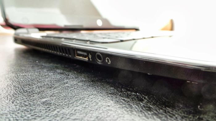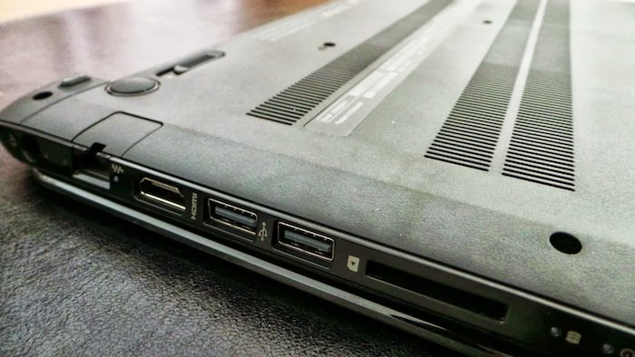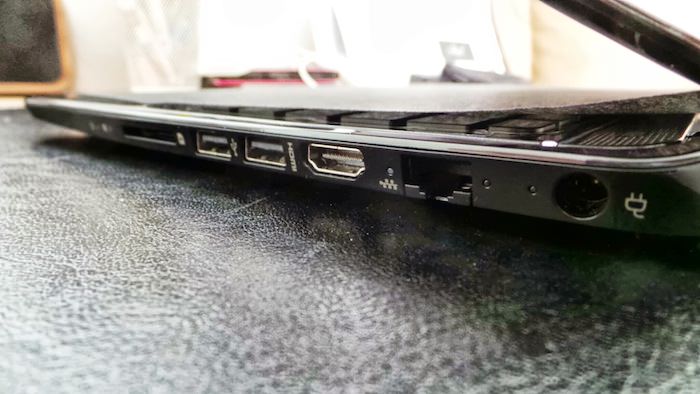 L’épaisseur atteint un maximum de 2,1 cm, ce qui est notamment du à un écran légèrement bombé, rendant l’ordinateur portable plus mince que les spécifications l’indiquent lorsque celui-ci est ouvert. Malgré son profil mince, HP a réussi à caser trois ports USB 2.0, un port HDMI, un port Ethernet et un lecteur de carte multimédia numérique multi-format pour carte MultiMediaCard (MMC) et SD. Si ces ports n’ont rien d’extraordinaires, ils sont tout de même très intéressants pour un Chromebook.