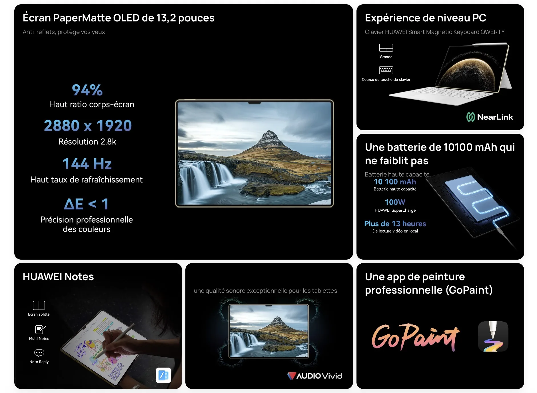 La MatePad Pro 13.2 est dotée d’un écran OLED flexible de 13,2 pouces avec une résolution de 2880 x 1920 pixels et un taux de rafraîchissement de 144 Hz. Son rapport écran/corps ultra-élevé de 94 % offre une expérience visuelle immersive. La technologie PaperMatte, grâce à un film optique innovant et une technologie de gravure, réduit les reflets et l’éblouissement pour un confort visuel optimal, même en cas d’utilisation prolongée. La luminosité maximale de 2000 nits et la prise en charge HDR Vivid garantissent des images éclatantes et détaillées.