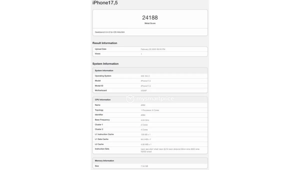 Selon les résultats de Geekbench, l’iPhone 16E obtient un score total de 24 188 points. Il est équipé d’un processeur Apple A18 à 6 cœurs et fonctionne sous iOS 18.3.1. Si l’iPhone 16e est doté de la puce Apple A18 comme le reste de la série iPhone 16, elle n’est pas exactement la même. Au lieu de cela, l’A18 sur l’iPhone 16e a un cœur GPU de moins, avec un GPU à 4 cœurs, tandis que les autres modèles d’iPhone 16 sont équipés d’un GPU à 5 cœurs.