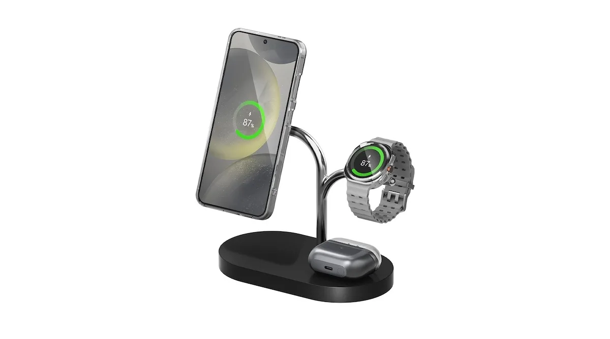 Annoncé comme une solution universelle de charge sans fil, ce chargeur 3-en-1 devait supporter la norme Qi2 via le Magnetic Power Profile (MPP), permettant une compatibilité aussi bien avec les iPhone que les Galaxy S25.