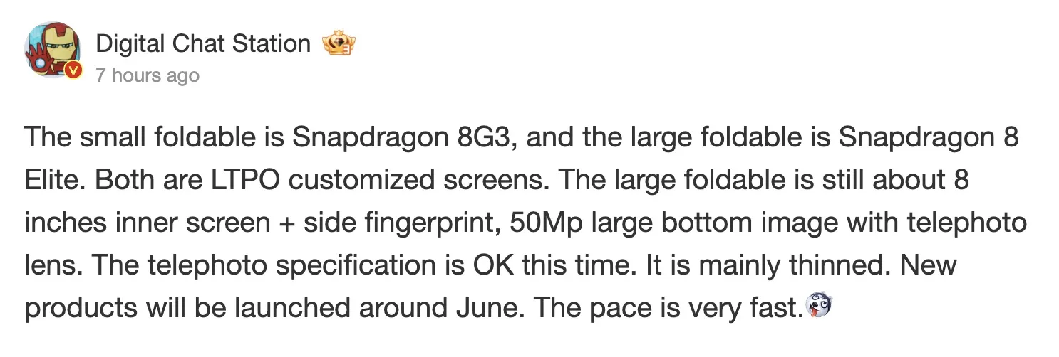 - Le Snapdragon 8 Elite dans sa version 8 cœurs (contrairement au Find N5, qui utilisera une version 7 cœurs du même chipset).