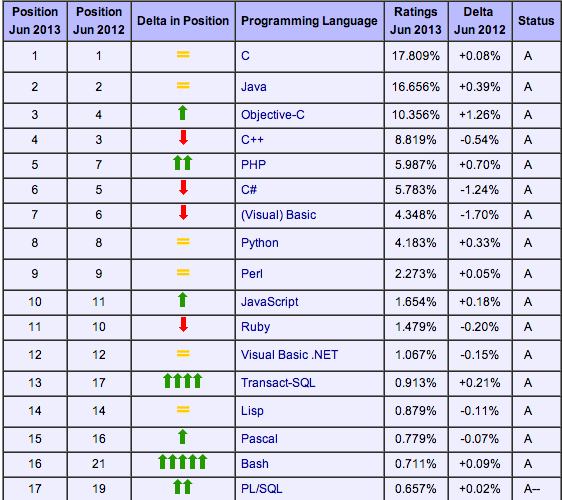 Parmi les autres enseignements que l’on peut en tirer, l’Objective-C monte progressivement dans l’échelle de l’index. En avril, la croissance avait calé, glissant derrière le C++ pour se classer à la quatrième position. Maintenant il reprend du poil de la bête, et vient surclasser le C++. C’est probablement dû à une augmentation du développement iOS. Dans les prochains mois, le langage devrait continuer de grimper notamment avec l’arrivée d’iOS 7 à l’horizon.