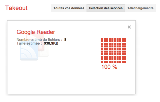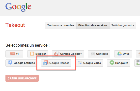 Pour ce faire, rendez-vous sur le service Google Takeout, un service lancé en 2011 vous permettant de récupérer l’ensemble de données personnelles stockées dans les différents services de la firme, et ce par l’intermédiaire des différents API. Une fois connecté, allez dans le volet “Sélection des services”. De là, cliquez sur “Reader” :