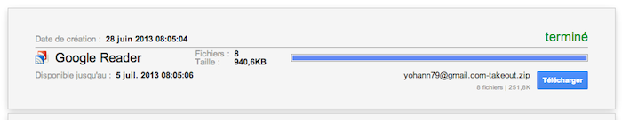 Une fois qu’il a terminé la construction, cliquez sur le bouton “Télécharger” qui apparaît pour récupérer vos abonnements (Si vous avez un grand nombre d’abonnements, vous pouvez alors choisir l’option d’être averti par e-mail à l’achèvement du processus d’archivage).