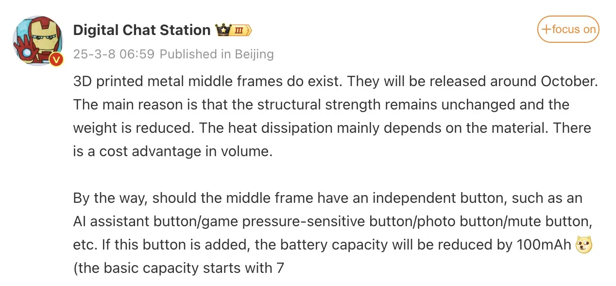 Un récent rapport laissait entendre que le prochain Xiaomi 16 Pro pourrait être doté d’un cadre central en métal imprimé en 3D. Aujourd’hui, un autre informateur bien connu, Digital Chat Station, a confirmé cette affirmation tout en fournissant quelques détails supplémentaires.