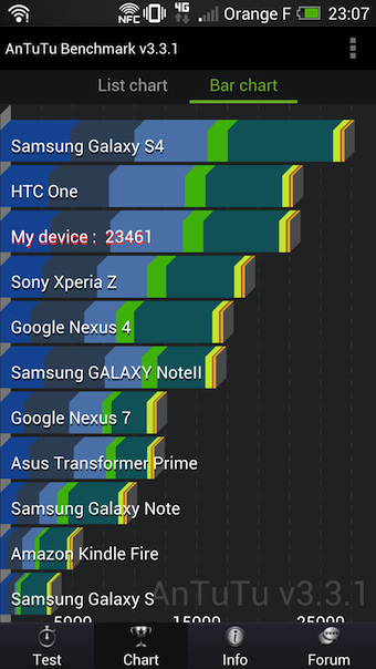 Arrivant avec un processeur quad-core Snapdragon 600 cadencé à 1.7 GHz et 2 Go de RAM, il en résulte une performance impressionnante. Dans l’ensemble, le One est réactif et rapide, que ce soit en parcourant l’interface Sanse ou les jeux et la vidéo. Si l’on considère le benchmark de AnTuTu, le HTC One (23461) se place bien au-dessus du Sony Xperia Z, du Galaxy Note II, mais en dessous du Galaxy S4 qui le dépasse à plat de couture.