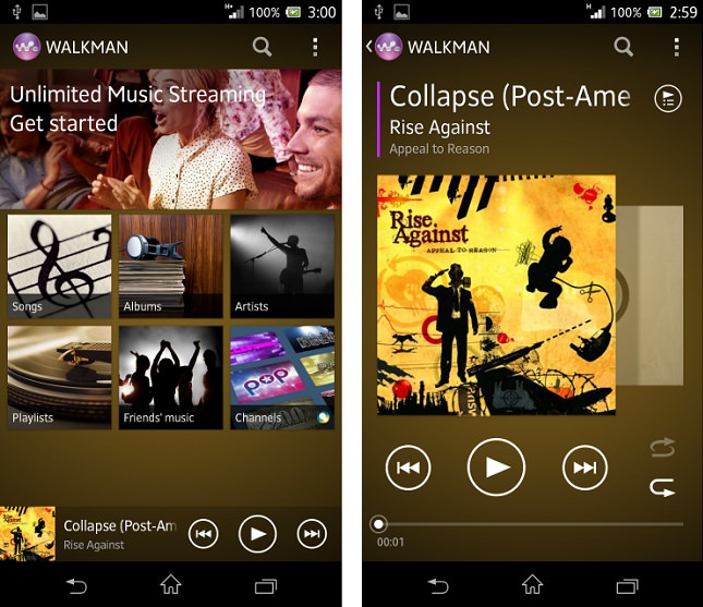 Le Sony Honami viendrait apparemment avec une nouvelle interface utilisateur, y compris un lanceur mis à jour, une nouvelle visualisation des applications, et même quelques nouvelles apps, comme la célèbre Walkman qui disposerait d’un look complètement rajeuni. De plus, elle permet de réaliser un rêve de longue date pour de nombreux utilisateurs Sony : l’intégration avec Music Unlimited, le service de diffusion de musique de Sony Entertainment Network. Voici la nouvelle application Walkman en action, montrant l’option “Streaming Music Unlimited” :