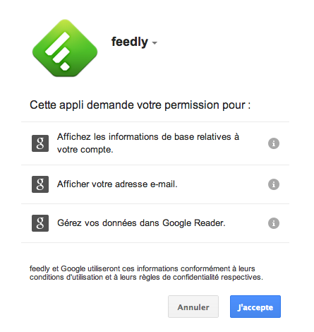2. Après avoir sélectionné un compte Google, vous serez invité à fournir l’autorisation à l’application Feedly de gérer vos données Google Reader. Acceptez bien évidemment