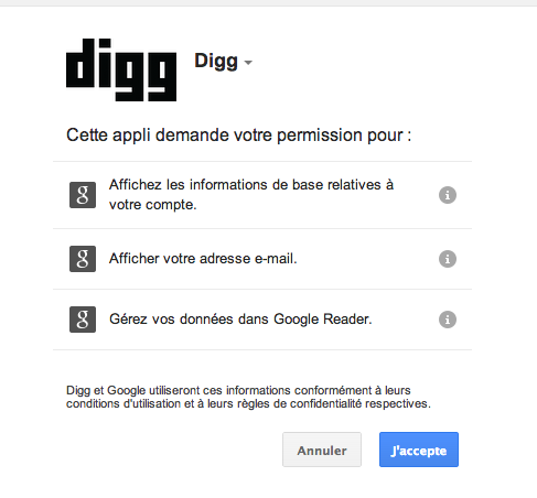 2. Sélectionnez le compte Google et fournissez les autorisations nécessaires à l’application Digg Reader