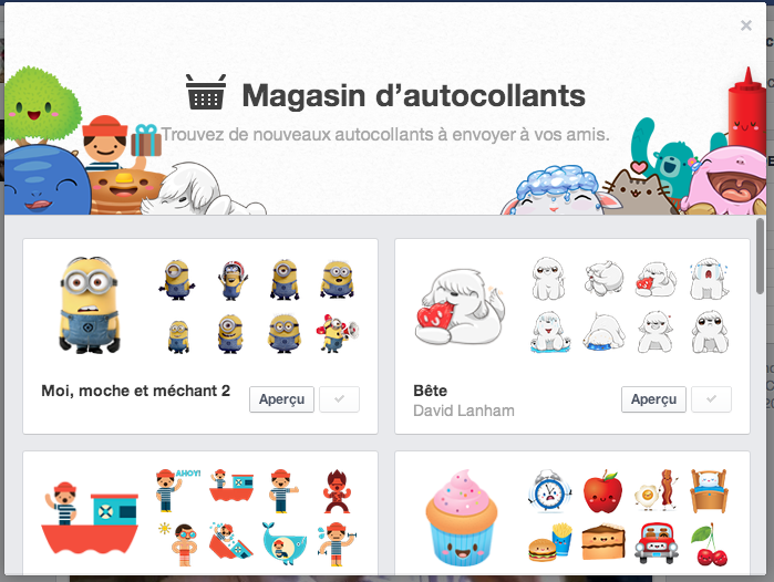 Si aucune des deux collections chatouillent votre fantaisie, vous pouvez cliquer sur l’icône du panier pour accéder au magasin d’autocollants, vous permettant ainsi de trouver de nouveaux autocollants à envoyer à vos amis, et ce depuis une liste existante. Tous les packs sont actuellement disponibles gratuitement, mais le fait que Facebook isole ces autocollants dans une page nommée “boutique”, signifie qu’elle a l’intension de vendre quelques packs pour une somme dérisoire dans le futur.