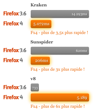 Mozilla a amélioré les performances Javascript, d’une meilleure gestion des objets JavaScript à la gestion de ECMAScript5, en passant par le tout nouveau moteur JavaScript JägerMonkey. J’ai réalisé un petit benchmark en ligne, permettant de constater que Firefox 4 a obtenu une note moyenne de 433, contre 389 pour IE9 sur le même système.