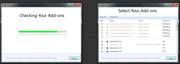 Côté expérience utilisateur nous pourrions voir arriver une nouvelle interface beaucoup plus simple et claire concernant la gestion des extensions et des plugins. Il sera ainsi possible aisément de désactiver ce que l’on souhaite, la vue d’ensemble étant plus petite qu’actuellement. Dans les améliorations liées aux extensions, on trouve un assistant de vérification et de compatibilité revue, qui offrirait l’avantage d’aller plus rapidement à l’essentiel en supprimant des étapes.