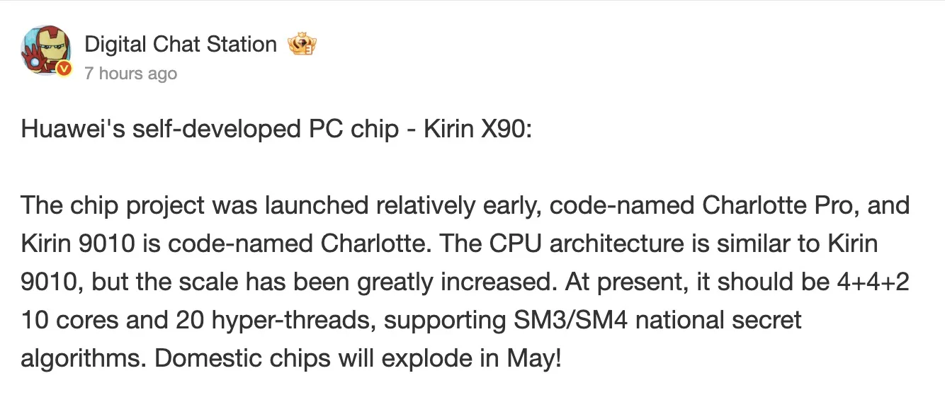 D’après le célèbre leaker Digital Chat Station, le Kirin X90, nom de code interne Charlotte Pro, est une puce 10 cœurs conçue spécifiquement pour les ordinateurs de bureau sous HarmonyOS.