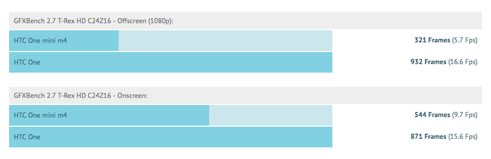En effet, une pleine page pour le HTC One Mini est récemment apparue sur le site web de GFXBench, révélant quelques informations à propos des spécifications techniques du smartphone, ainsi que ses performances graphiques par rapport à son grand frère, le HTC One, grâce à un couple de points de repère.