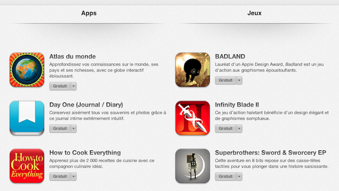 Parmi les apps ont va retrouver notamment des jeux Infinity Blade II – un jeu d’action, Superbrothers: Sword and Sworcery EP – un jeu de casse tête, Badlands – un jeu d’action aux graphismes époustouflants ou encore Tiny Wings et Jetez-vous à l’eau !