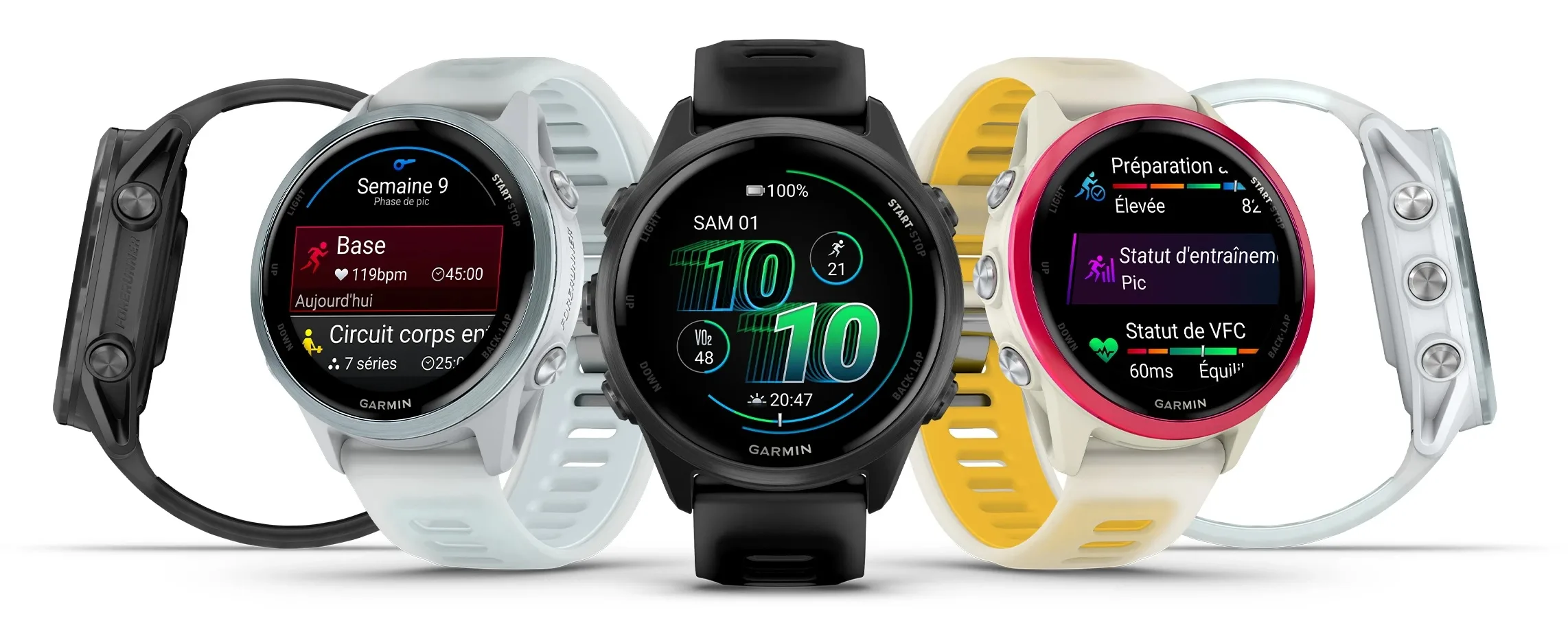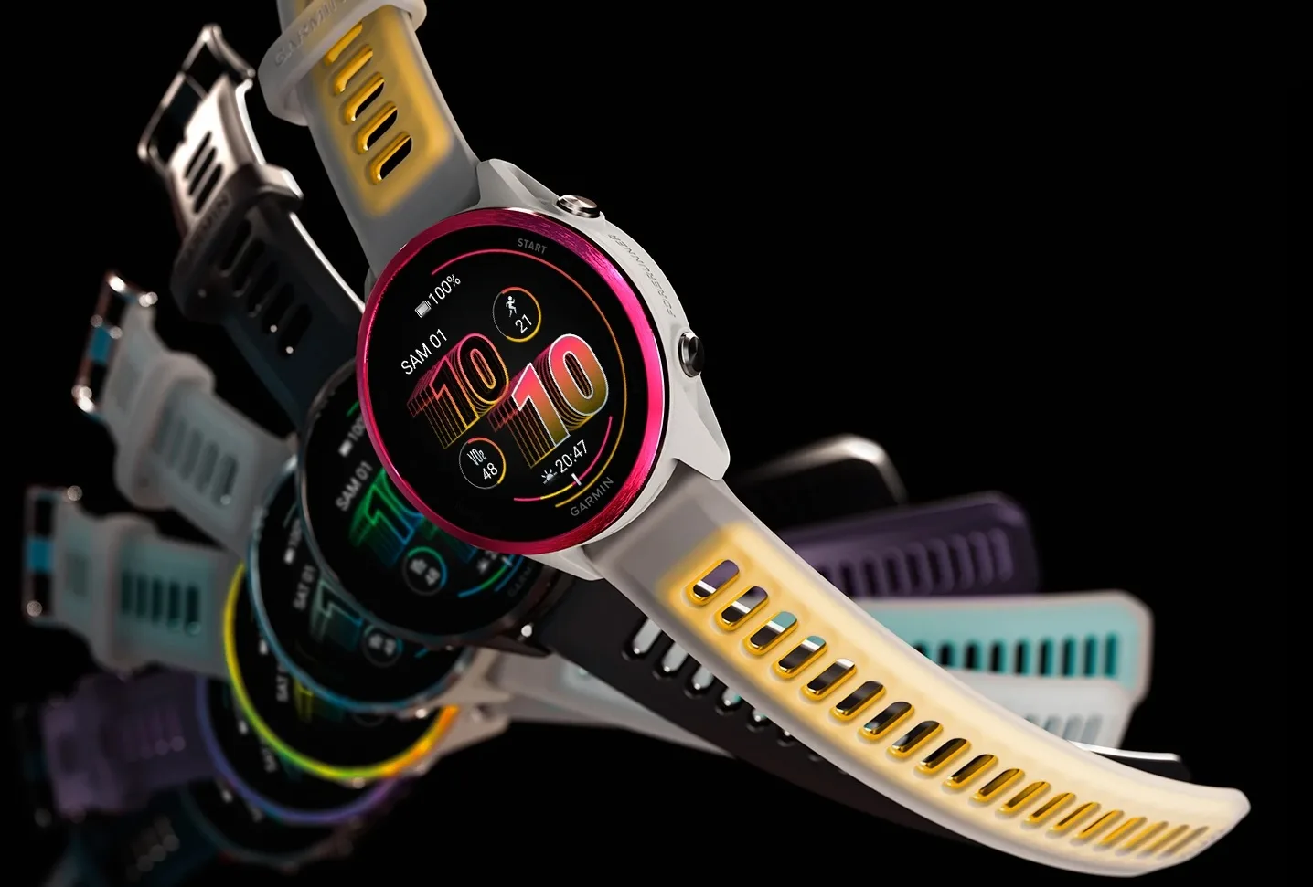 Garmin casse ses habitudes esthétiques avec des déclinaisons colorées plutôt audacieuses. En plus du noir ou du gris standard, on trouve des éditions framboise-mangue, turquoise-blanc translucide, ou encore jaune-ampère, bien loin des designs ternes des montres sportives traditionnelles.