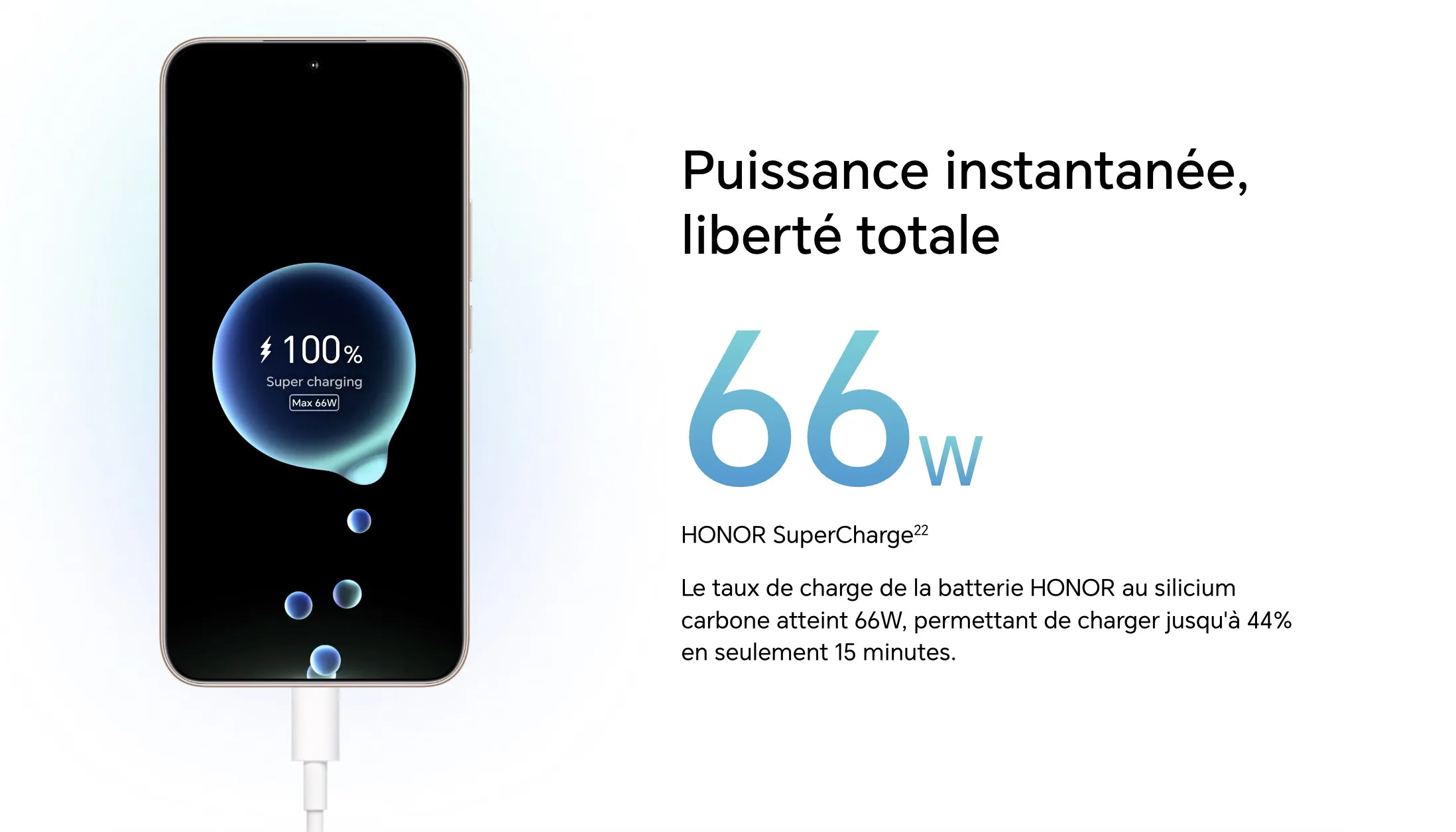 Par rapport au HONOR 200, le HONOR 400 augmente légèrement la capacité de batterie, passant de 5 200 à 5 300 mAh. Ce gain, bien que modeste, s’appuie sur la technologie silicium-carbone, plus performante et plus endurante dans le temps. Il s’agit d’une capacité supérieure à la moyenne des smartphones de sa gamme de prix.