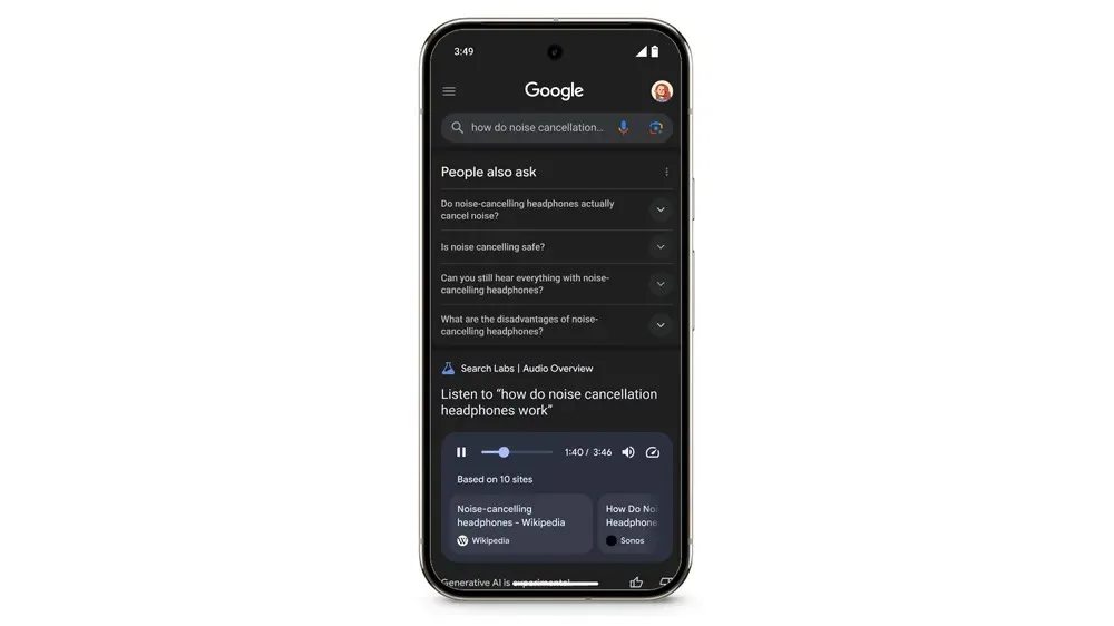 Disponible uniquement sur mobile, cette nouvelle fonctionnalité expérimentale s’intègre sous le module « Autres questions posées » avec un bouton intitulé « Générer une synthèse audio ». Une fois cliqué, il faut attendre environ 40 secondes pour que l’audio soit prêt.