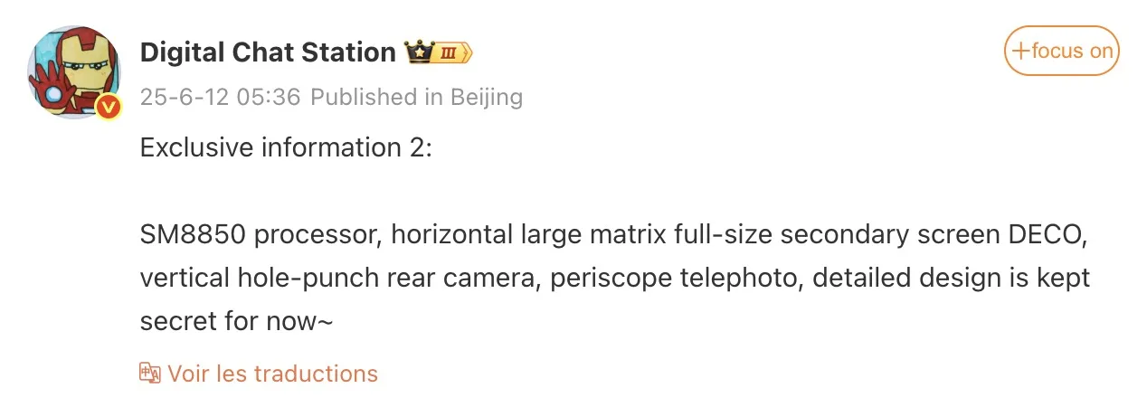 Bien que le nom de Xiaomi ne soit pas explicitement mentionné dans la publication, les indices sont suffisamment clairs. Il y est fait référence à un flagship équipé du SoC Qualcomm SM8850, alias le Snapdragon 8 Elite 2, ainsi qu’à un châssis arborant un « large écran secondaire horizontal de type DECO ». Le capteur téléobjectif périscopique et la disposition verticale du module caméra viennent confirmer qu’il ne s’agit pas d’un pliable, mais bien d’un smartphone à écran large traditionnel.