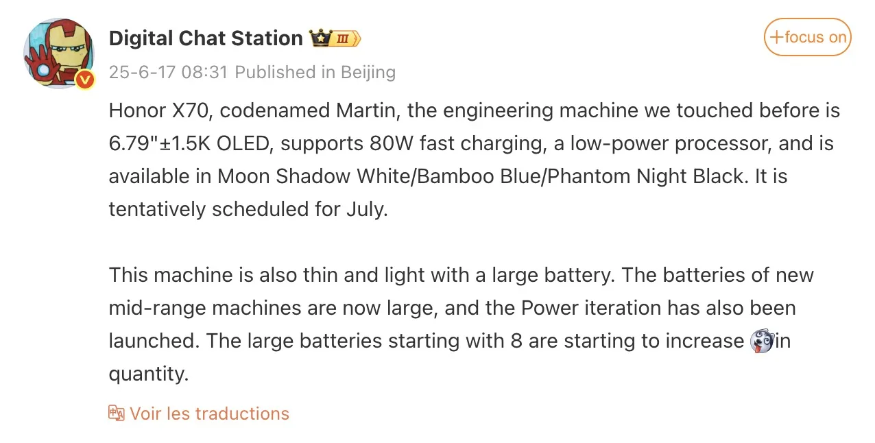 Honor s’apprête à enrichir sa gamme de smartphones milieu de gamme avec un nouveau modèle attendu dès le mois de juillet. D’après une fuite émanant de la source bien connue Digital Chat Station, ce futur appareil, probablement baptisé Honor X70, viendra succéder au Honor X60 avec une fiche technique revue à la hausse et un design toujours aussi soigné.