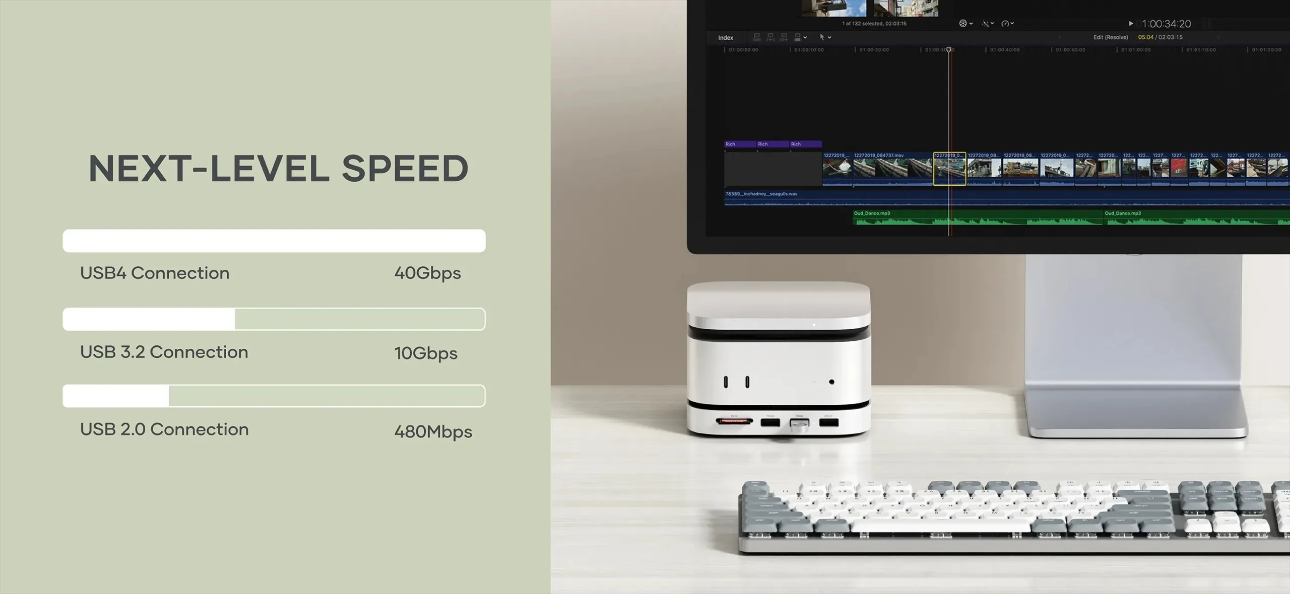 Le boîtier prend en charge les SSD NVMe au format M.2 2230, 2242, 2260 et 2280, avec des capacités allant de 1 To à 8 To. Grâce à la norme USB4, il peut atteindre des vitesses de transfert allant jusqu’à 40 Gb/s, soit 8x plus rapide que l’USB 3.0 traditionnel. Une telle bande passante permet, par exemple, de transférer 10 films 4K en moins de 40 secondes.