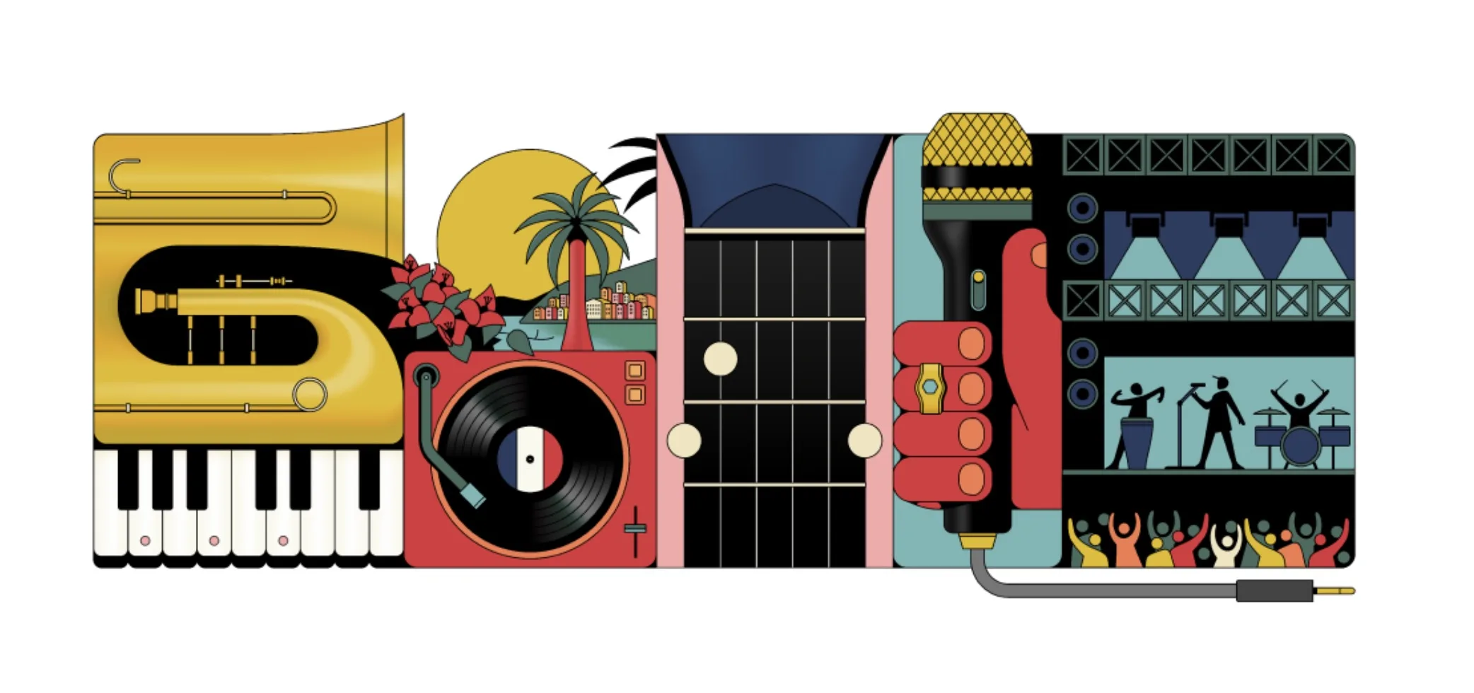 Le Doodle d’aujourd’hui transforme les lettres de « Google » en une série d’illustrations musicales : clavier de piano, tuba, vinyle, guitare, micro et scène de concert sont autant d’éléments qui symbolisent la diversité musicale célébrée dans le monde entier. L’ambiance tropicale, les projecteurs et les silhouettes de musiciens et danseurs rendent hommage à toutes les musiques, des rues de Paris aux plages de Rio.