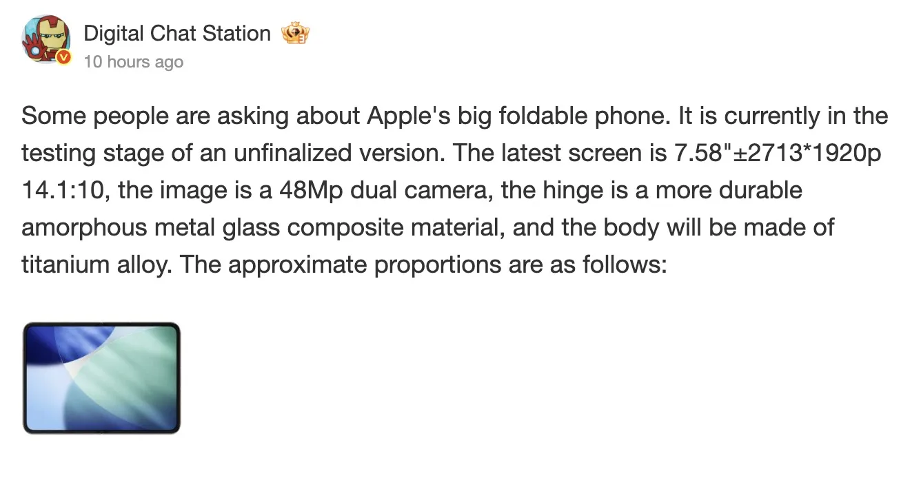 Apple travaillerait activement sur un prototype de smartphone pliable, alias iPhone Fold, qui pourrait voir le jour en 2026. Les dernières fuites techniques révèlent un écran intérieur de 7,58 pouces, associé à une définition de 2713 × 1920 pixels (format 14,1:10), ce qui le place nettement en deçà du futur Galaxy Z Fold 7 de Samsung, attendu avec un écran de 8,2 pouces ou plus.