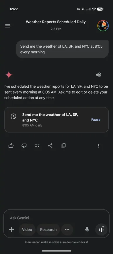 Le principe est simple : l’utilisateur envoie une instruction précise accompagnée d’un créneau horaire ou d’une fréquence. Gemini confirme alors la demande et l’exécute automatiquement à l’heure prévue. Vous pouvez par exemple demander à Gemini :