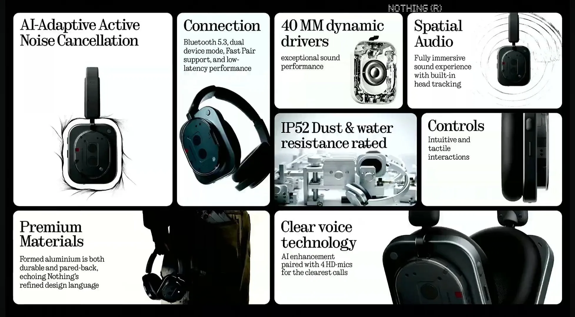 Nothing a une nouvelle fois opté pour une esthétique unique : des coques transparentes réalisées en collaboration avec KEF, la célèbre marque hi-fi, offrant un contraste entre minimalisme et visibilité des composants. La structure combine des éléments en aluminium travaillé et des plastiques robustes, tandis que les coussinets en mousse à mémoire de forme, résistants à l’huile, s’adaptent à l’anatomie de l’oreille pour un confort de longue durée.