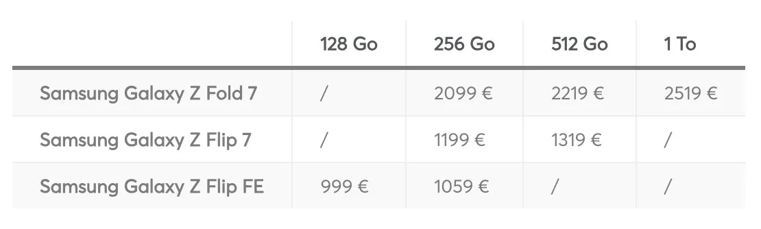 Bonne nouvelle du côté du Z Flip 7 : son tarif ne devrait pas évoluer, malgré un écran externe élargi, un design plus compact et une batterie potentiellement plus grande. Le Galaxy Z Flip 7 resterait ainsi à 1 199 euros en France, selon les mêmes sources.