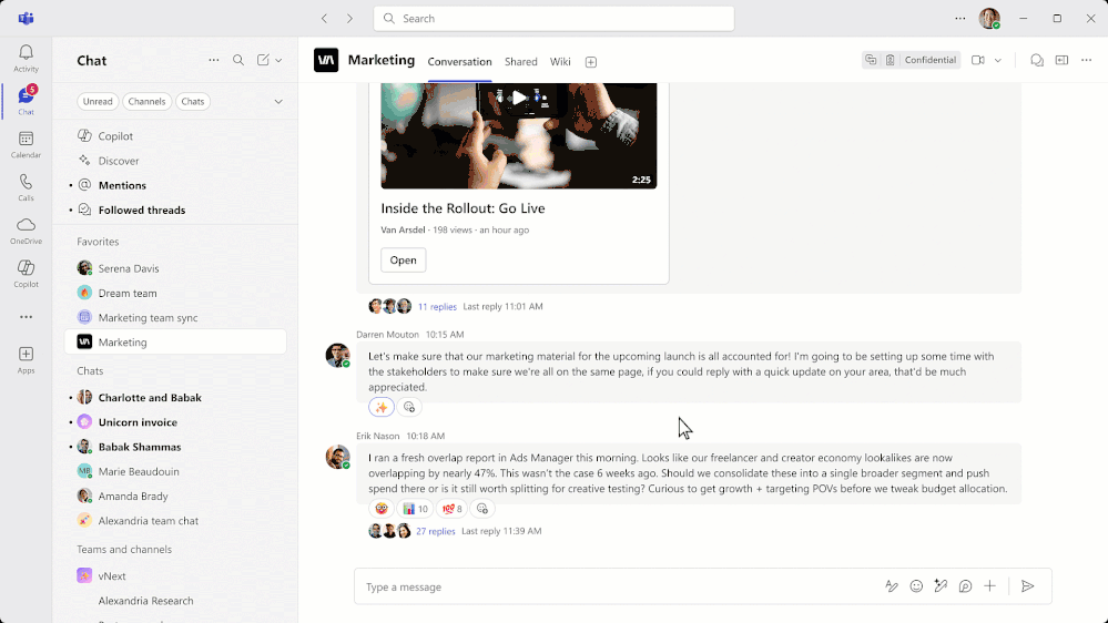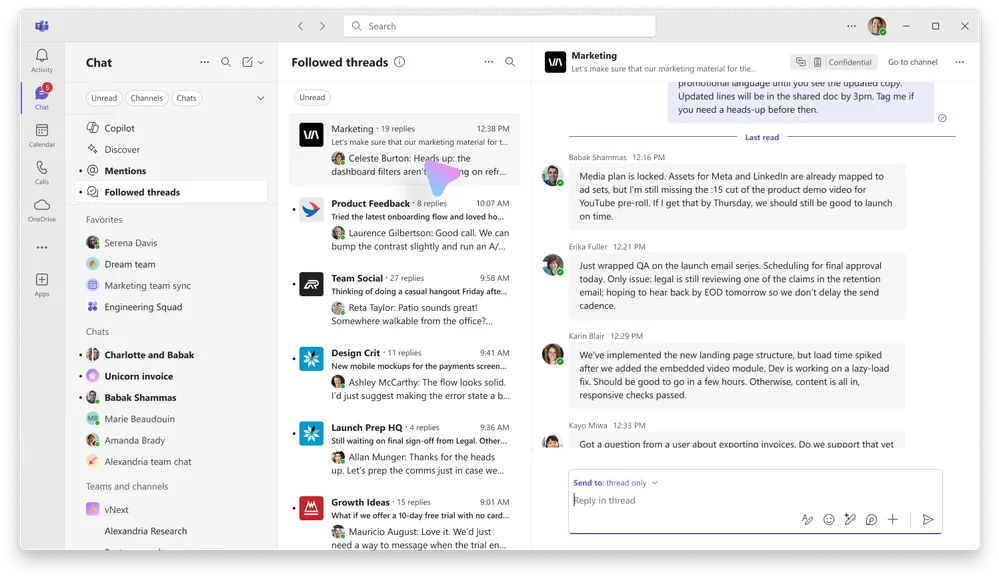 Selon Noga Ronen, directrice du marketing produit chez Microsoft Teams, cette approche permet d’éviter que les utilisateurs aient à parcourir tous les messages pour comprendre ce qui se passe. Chaque membre peut ainsi suivre uniquement les fils qui l’intéressent, et se désengager facilement des discussions trop bruyantes.