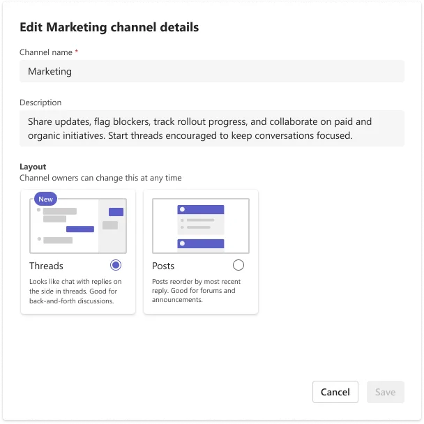 Contrairement à Slack, où l’usage des fils est fluide et contextuel, Microsoft impose un choix au niveau de chaque canal : il faudra opter pour un mode « posts classiques » ou un mode « threads ». Ce paramétrage devra être effectué par les administrateurs de chaque canal en fonction de la nature des échanges attendus.