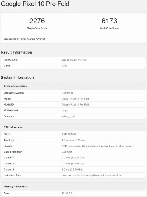 Le Pixel 10 Pro Fold embarquera la toute nouvelle puce Tensor G5, une évolution majeure par rapport au G4. Selon les données issues de Geekbench, la puce repose sur une architecture octa-core inédite en 2+5+1 :