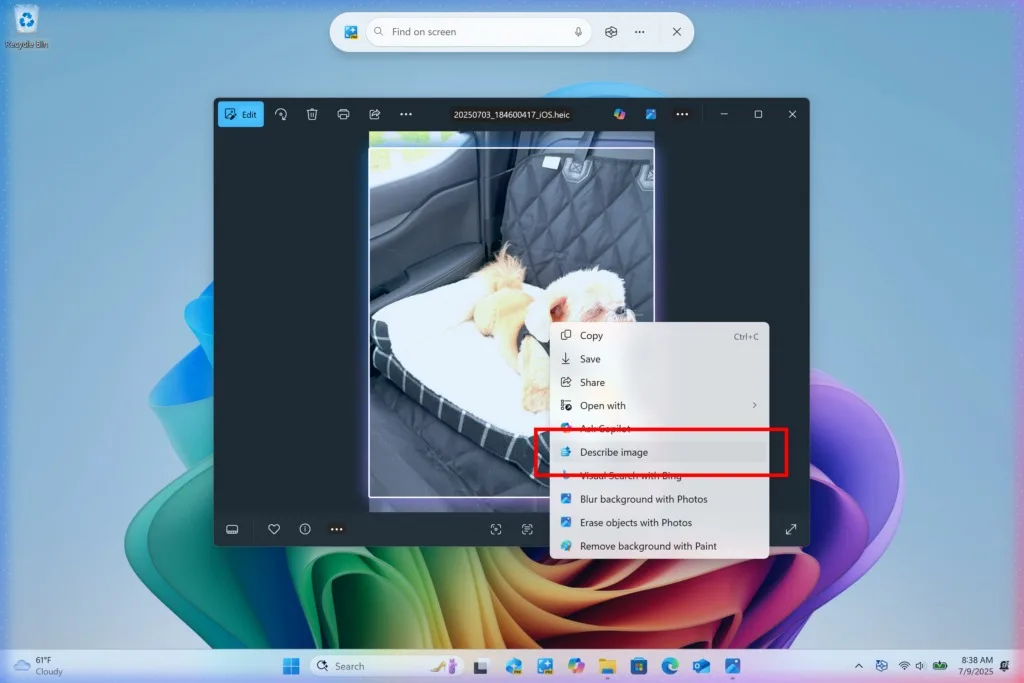 Disponible depuis la build Windows 11 Insider Preview 26200.5702 (KB5062653) sur le canal Dev, cette fonctionnalité génère une description textuelle d’une image sélectionnée, en un clic, à l’aide d’un modèle IA exécuté localement sur votre appareil. L’objectif est double : accessibilité renforcée et productivité accrue.