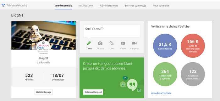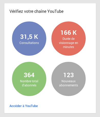 Ok c’est bien beau mais je vous ai déjà expliqué tout ceci alors pourquoi le faire à nouveau ? Et bien une fois que vous avez réalisé cette étape, sachez que toutes les statistiques de votre chaîne YouTube vont se retrouver intégrées au sein de votre page Google+. En effet, comme vous pouvez le voir dans la capture ci-dessous, vous allez disposer dans quatre cercles colorés les statistiques sur les 30 derniers jours.