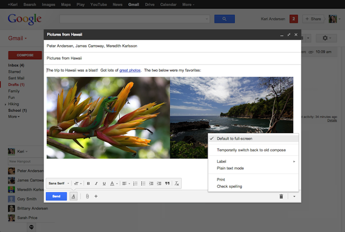 Lorsque vous activez cette nouvelle option (en cliquant sur le bouton d’agrandissement en haut à droite), la fenêtre de rédaction sera centrée dans votre boîte de réception, et s’étendra pour s’adapter à votre écran. De plus, la barre d’outils de mise en forme sera alors activée par défaut dans le but de vous offrir tous les outils en un seul clic. En outre, et plus important encore, vous pouvez définir par défaut l’affichage en plein écran en cliquant sur le menu “Plus”, à côté de l’option “Supprimer”, dans le menu des options en bas à droite.