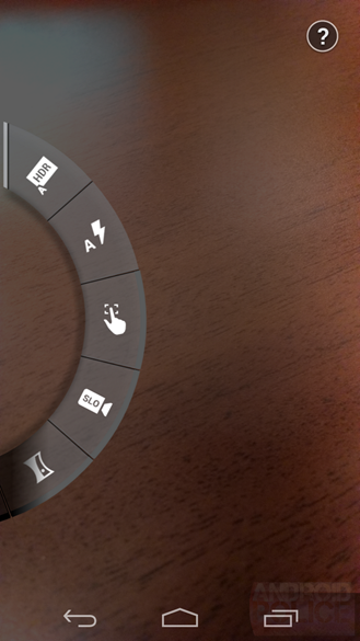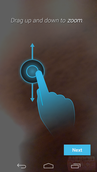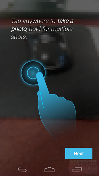 Le fait de toucher l’écran pour rendre visible les options semble avoir disparu, laissant l’écran disponible pour d’autres choses. Cette fois-ci, nous utilisons le toucher pour prendre des photos, ce qui ressemble à ce que propose d’ores et déjà Android 4.2. De plus, afin de prendre de multiples clichés, il suffira de taper à plusieurs reprises sur l’écran pour prendre des clichés en rafale. Balayer vers le haut ou vers le bas permettra de zoomer, plutôt que du pincement sur Android 4.2.