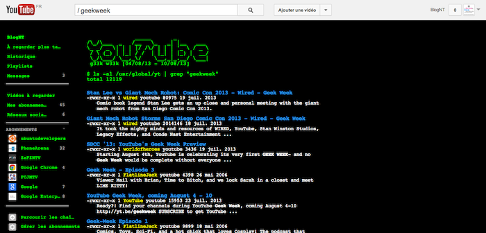 Pour célébrer son prochain événement, YouTube a commencé une chasse aux Easter Eggs sur son flux Twitter. Si vous voulez voir tout ce que le géant de la vidéo a prévu, mais que vous ne pouvez pas déchiffrer ses 140 caractères, j’ai tout ce qu’il vous faut. Simplement saisir /geekweek dans le champ de recherche de YouTube, ou simplement en cliquant sur ce lien. Attention, vos yeux pourraient vous haïr…