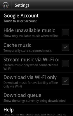 En effet, lorsque l’on regarde de plus près les paramètres de l’application, on trouve une poignée d’options qui semblent être liés à la longue discussion qu’il y a actuellement sur le service Google Music. Il est possible de sélectionner un compte Google pour se connecter à l’application, un autre vous permet de stocker temporairement en cache des fichiers de musique en streaming permettant sans doute d’améliorer les performances.