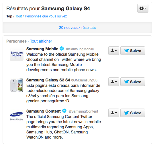 En plus de mettre en valeur les tweets contenant le mot ou la phrase recherché – qui peut se vérifier en cliquant sur les “nouveaux résultats”, il y a maintenant une zone encadrée séparée pour les résultats provenant d’une personne, et ceux qui sont mentionnés.