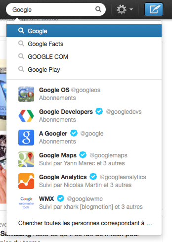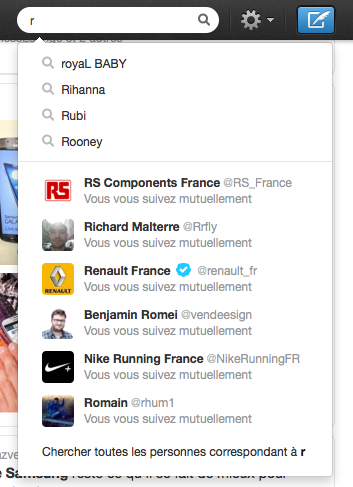 Twitter a maintenant de meilleures capacités prédictives quand il s’agit d’afficher les résultats de recherche, et ce après avoir renseigné au moins un caractère vous avez immédiatement la liste de résultats qui incluent des phrases possibles ainsi que tout compte Twitter poignée qui correspond à votre recherche ainsi que votre relation actuelle avec eux.