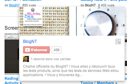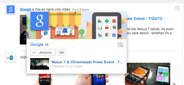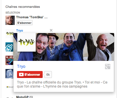 La carte montre les images et la description de la chaîne, un lien vers la page Google+, un bouton d’abonnement, le nombre d’abonnés et parfois la vidéo la plus récente de la chaîne.